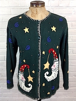 (mens 2XL) Ugly Xmas Sweater Cardigan, Crescent Moon Santa, Stars, Pearly Beads!
